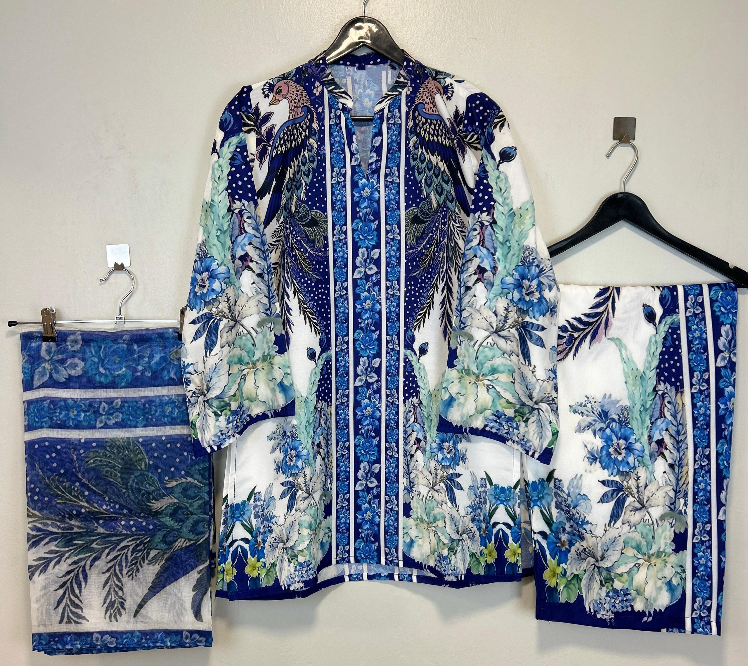 Digital Printed Silk Shirt, same fabric digital trouser, Monar Digital Dupatta, Stitched with embellishments