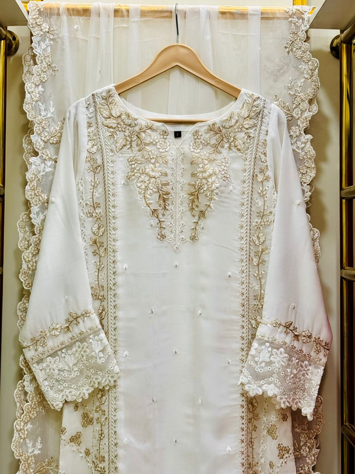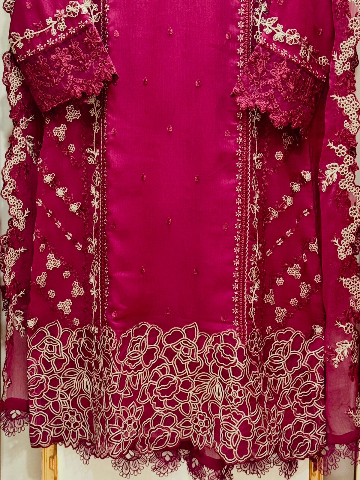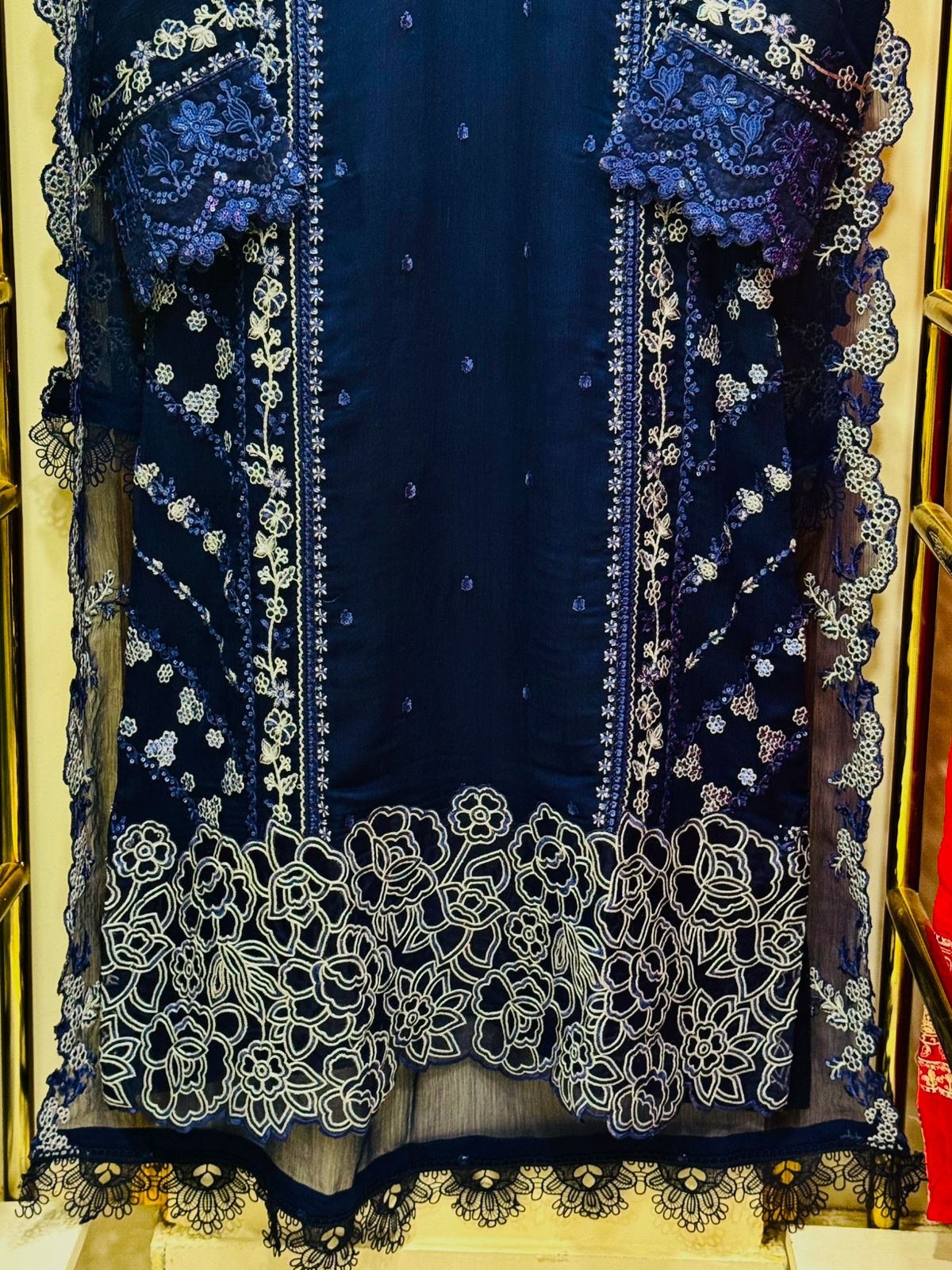 Chiffon Fully Heavy Embroided Long Length Airline Shirt With Cotton Silk Inner With Gorgeous Cutwork Border