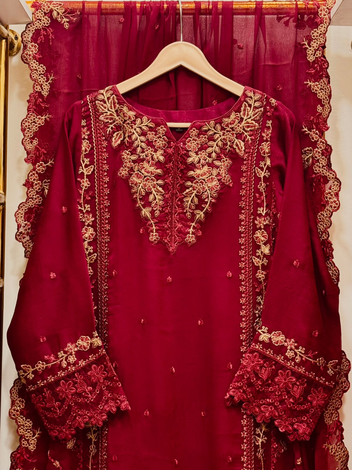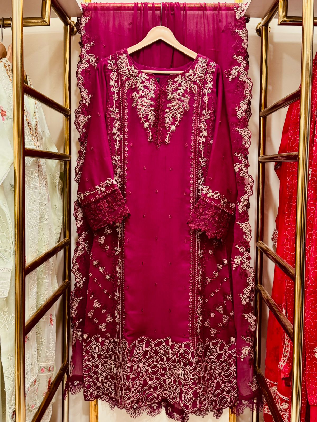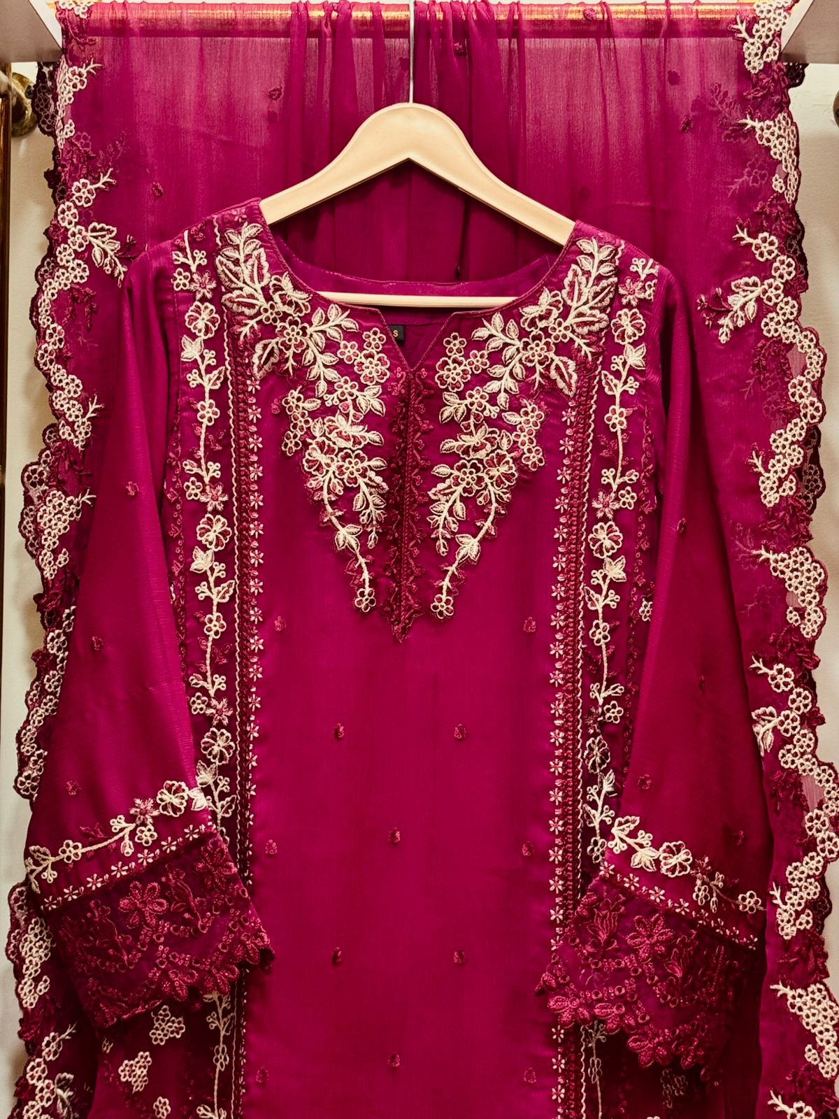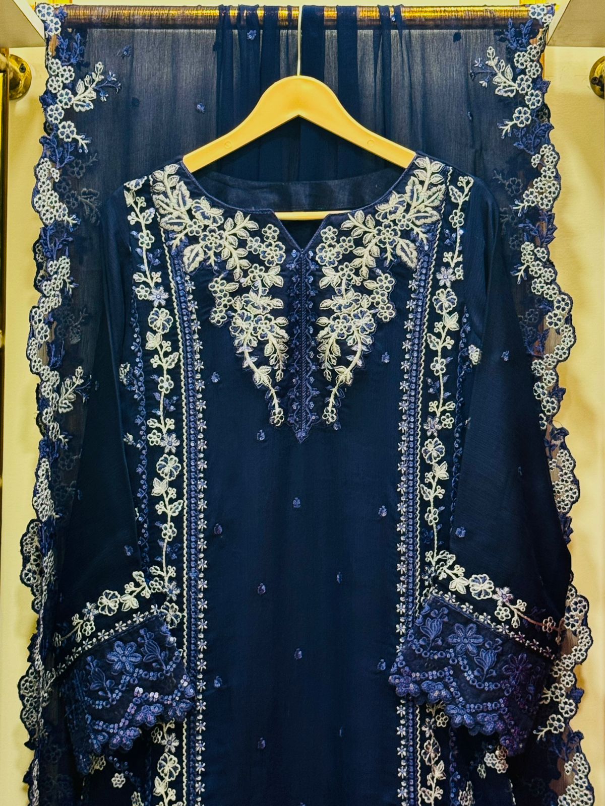 Chiffon Fully Heavy Embroided Long Length Airline Shirt With Cotton Silk Inner With Gorgeous Cutwork Border